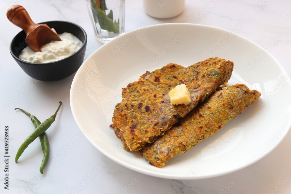 Radish or Mooli masala Paratha served on a white plate with butter cubes. Served with curd, pickle, and green chili. copy space. Muli ke parathe. Radish masala roti.