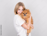 A beautiful blonde young woman hugs and kisses her spitz puppy. Love between dog and owner. Isolated on a gray background.
