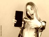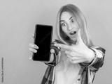 Surprised happy blonde woman in shirt showing blank smartphone screen and pointing at it while looking at camera with open mouth on pink background