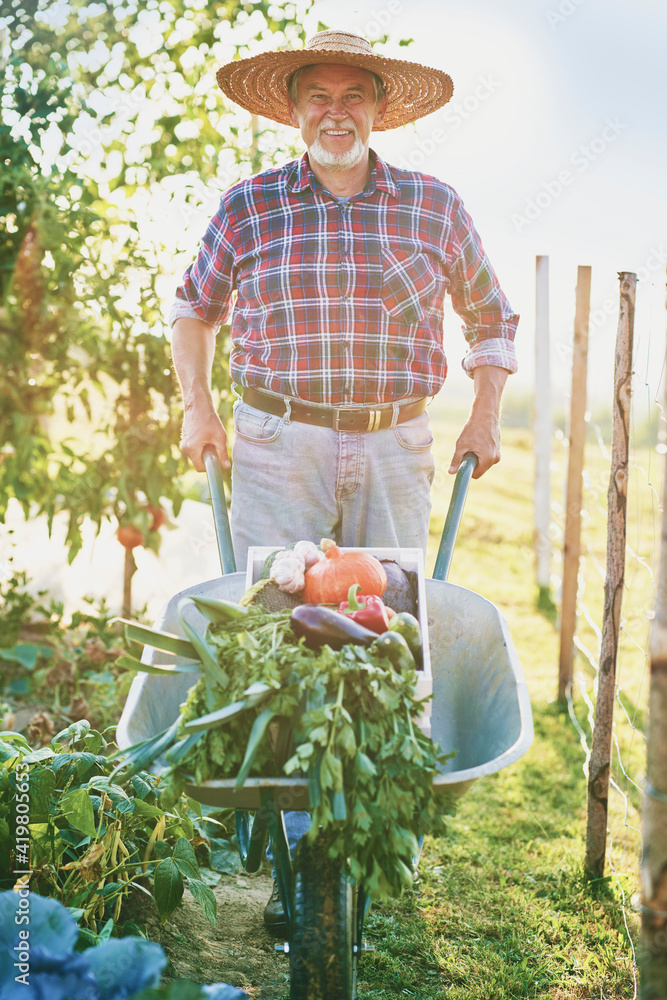 Portrait of farmer pushing wheelbarrow full of vegetables