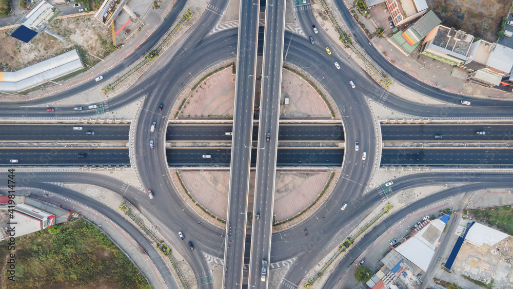 Aerial view of road intersection with roundabout. Urban highway interchange with cars speeding. Junction network of transportation taken by drone.