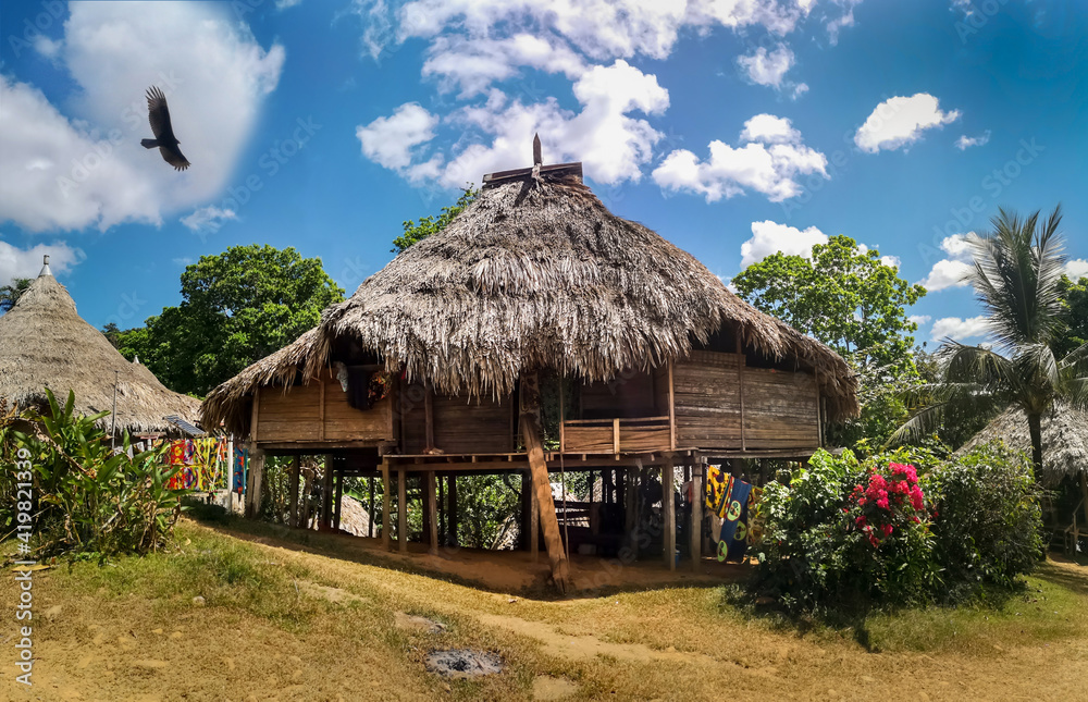 Traditional house of Embera tribe in Panama with Eagle flying above the house. Blue sky with white clouds above, and green garden flowers in front of the house