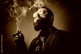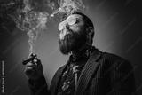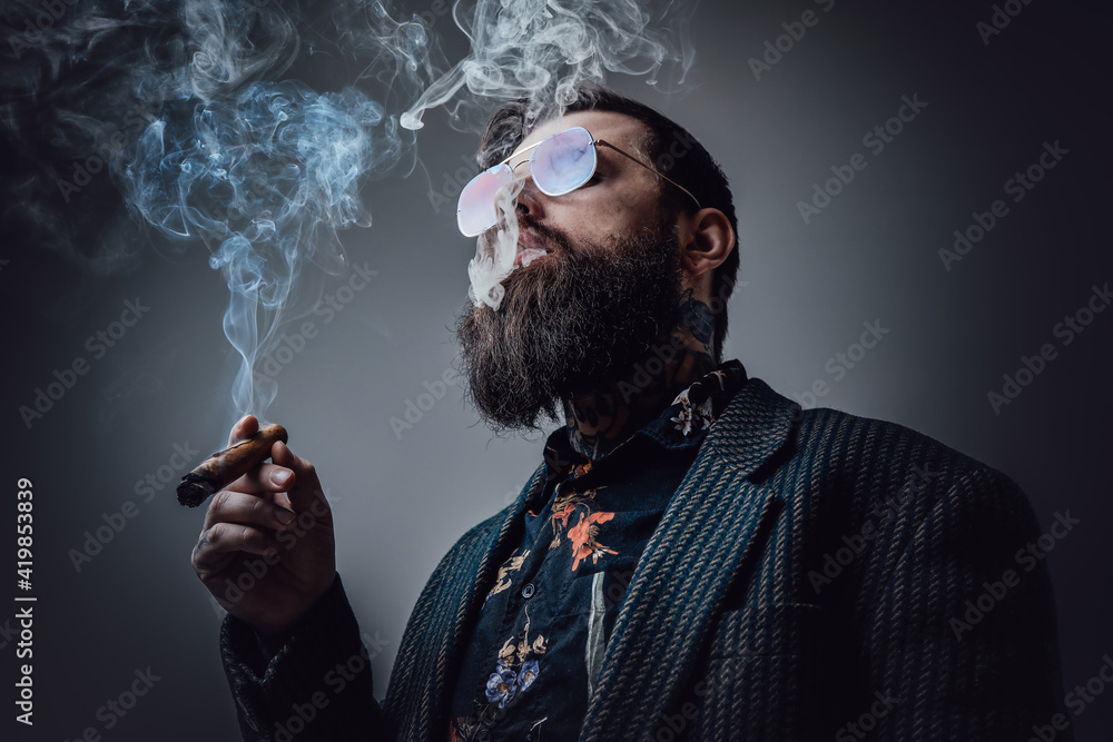 Elegant man in retro style poses in dark background smoking cigar. Portrait of a bearded guy with stylish coiffure.