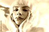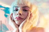 Young blond teen girl with smooth skin and modern fashion makeup with sparkles on face.