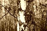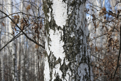 Young birch with black and white birch bark in spring in birch grove against background of other birches