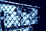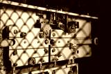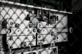 The view through the grating of the elevator shaft. Old elevator in an abandoned house. Metal mechanisms.
