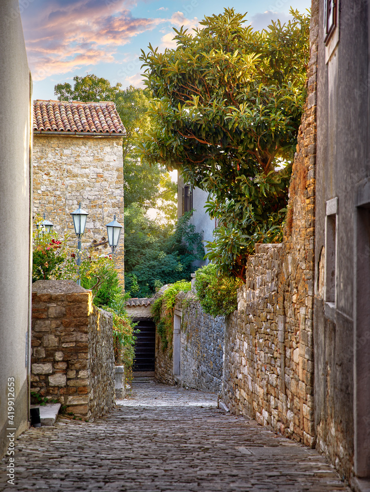 Rovinj Croatia. Vintage stone street with old house street lamp tegular roof and green tree. Picturesque landscape old town in Europe.