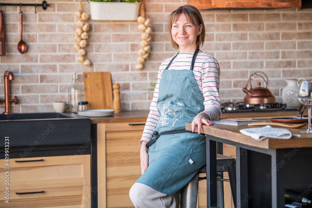Happy woman in a linen apron standing in kitchen at the table with a smile looks out the window