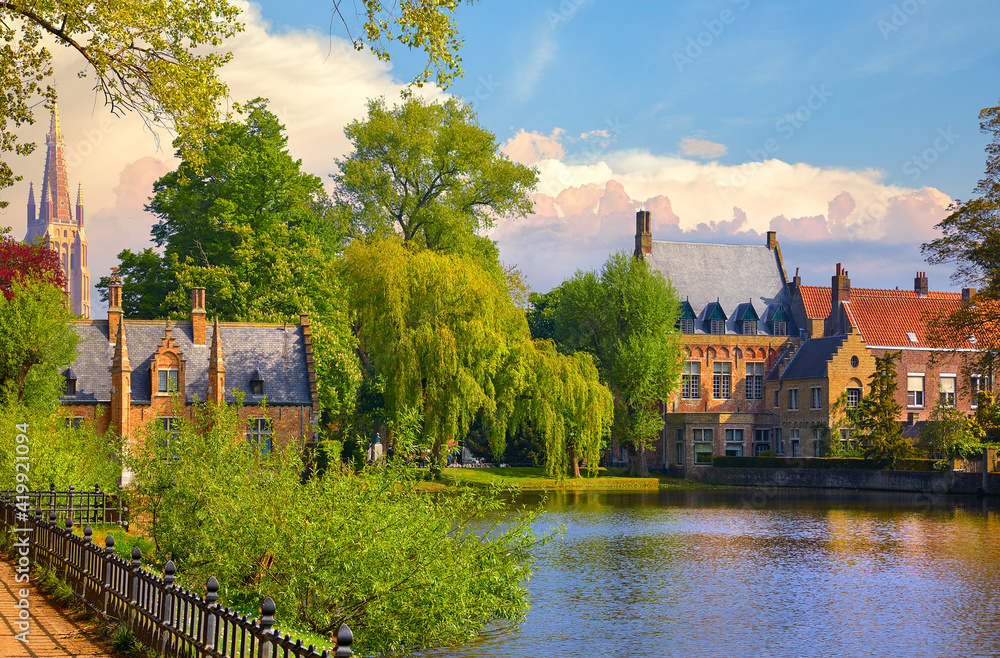 Vintage building over lake of love in Minnewater park in Bruges Belgium near Beguinage monastery of Beguines. Picturesque landscape with green trees sunset time.