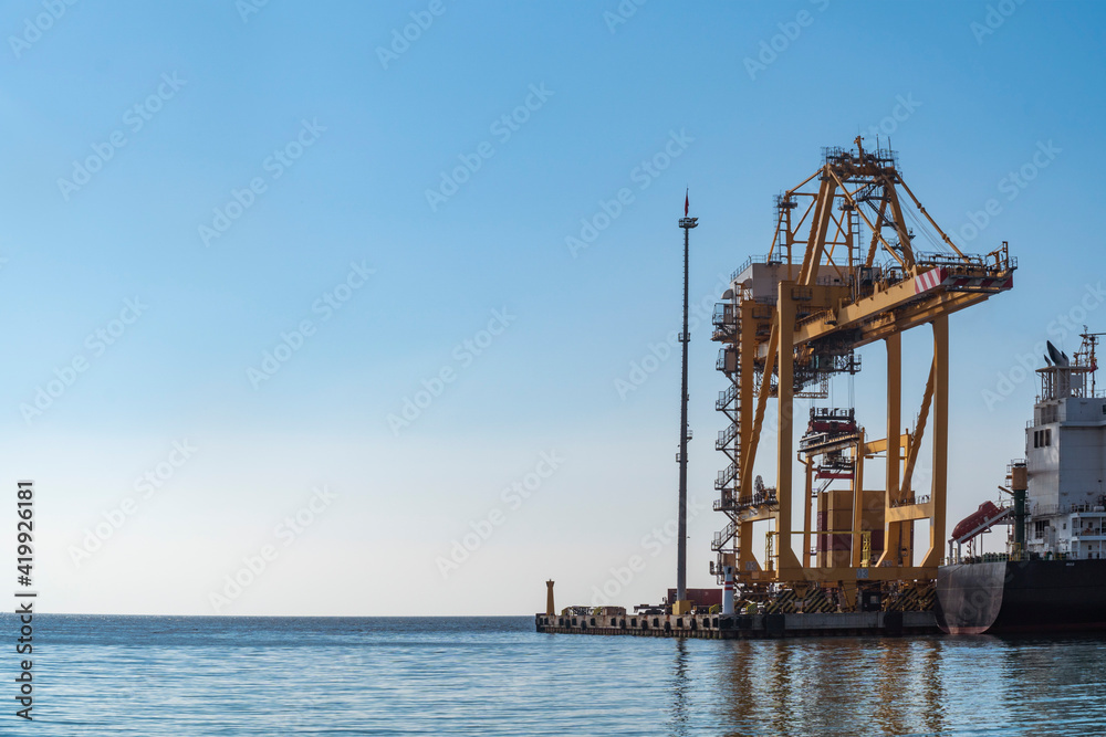 Worldwide shipping and cargo concept: View on yellow crane lift standing at a dockyard to move containers. Construction equipment for logistics. Global import export crises due to Covid-19 pandemic
