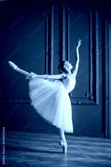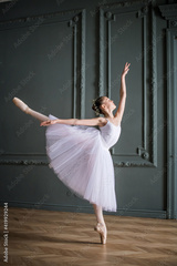 young slender ballerina in white tutu dances on pointe shoes in a spacious, bright room with large windows.