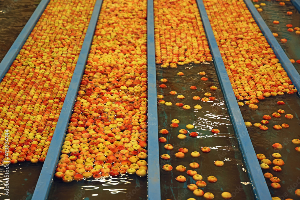 Apples floating in a sort of water conveyer, washing and grading in a fruit packing warehouse