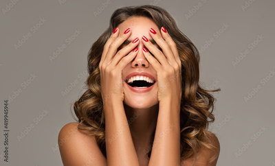 Beautiful woman with curly hair and red nails manicure . Girl happy laughs closes her face with a hand .