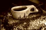 A wooden mug of kuks with black tea in the campaign, next to a green spruce branch.