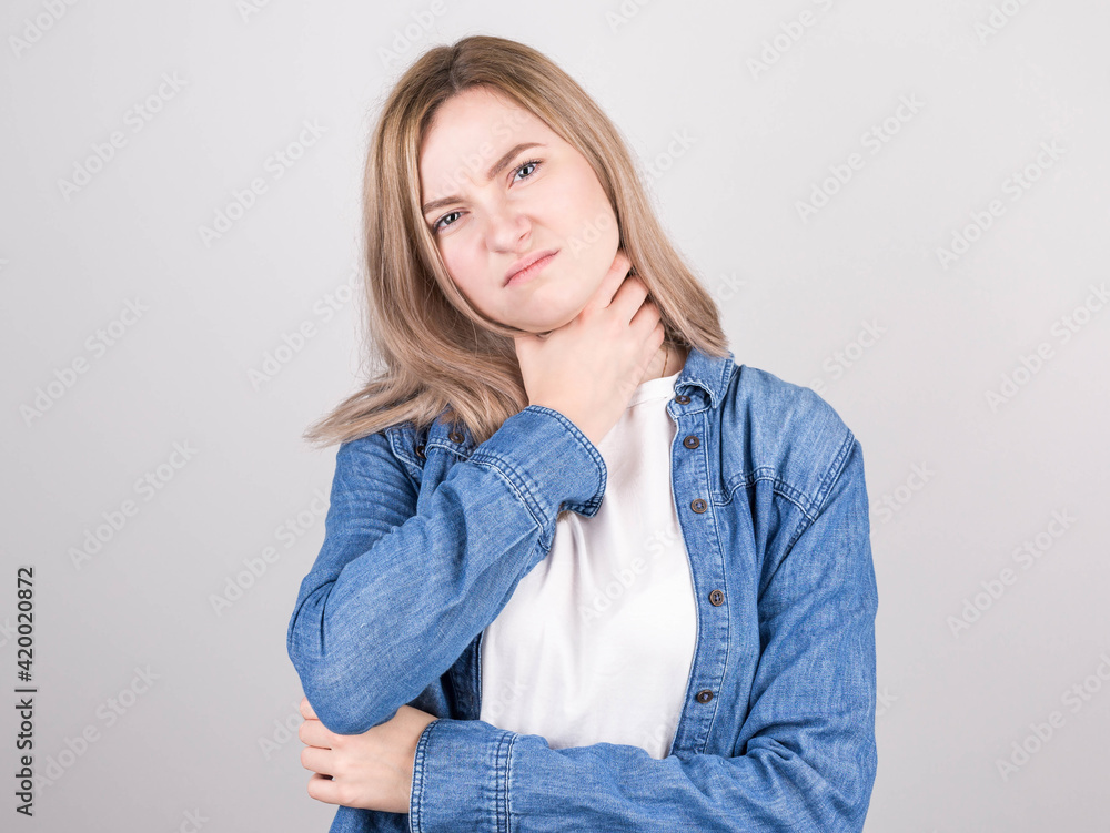 Studio portrait of young unhealthy coughing blonde woman in white t-shirt and denim shirt suffering from colds and flu, sore throat, feeling bad, medicine and health care concept on gray background