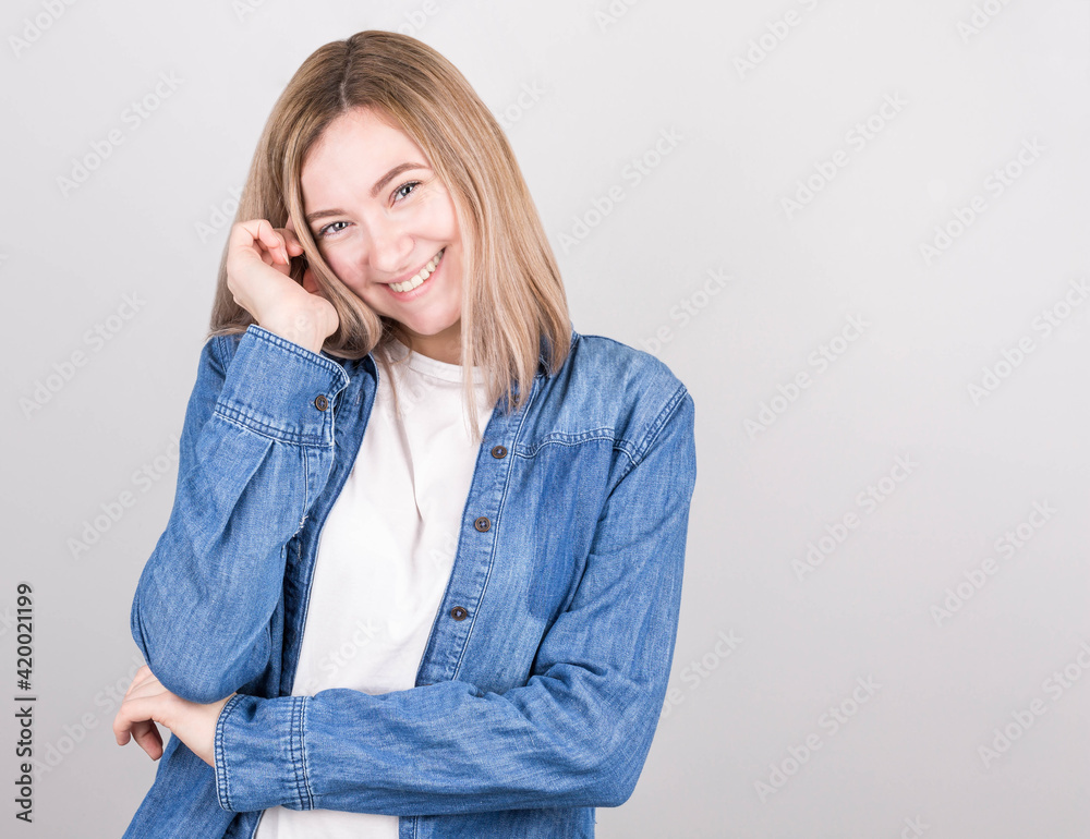 A beautiful woman with blonde hair in a white T-shirt and a denim shirt is embarrassed, smiling cute, hand near the face.