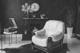 Retro vintage interior. Retro living room interior in dark black colors. Retro leather chair and fireplace