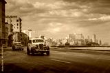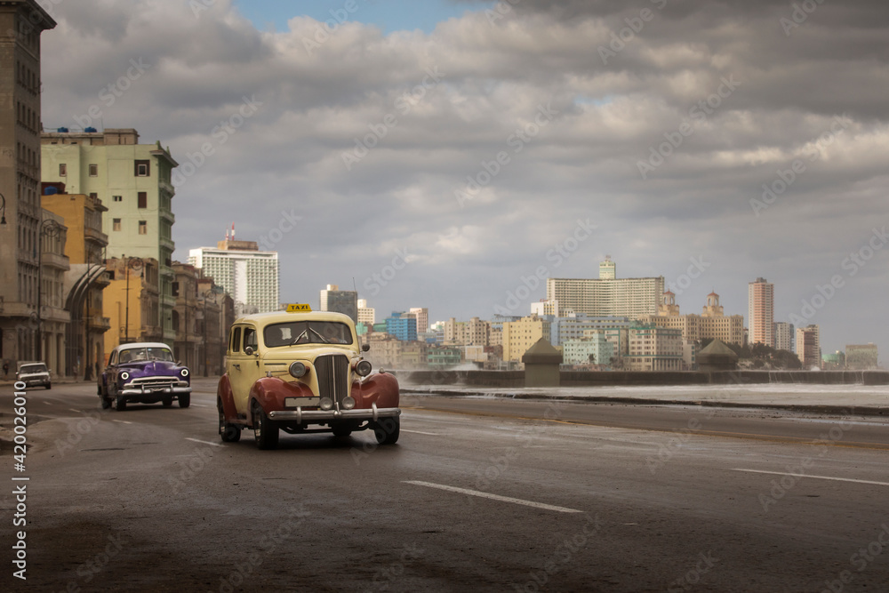 Old car on Malecon street of Havana with storm clouds in background. Cuba