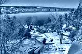 Scenic view on lakeshore of Seneca Lake, New York. Winter landscape on a sunny calm day.