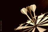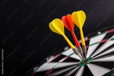 Red and yellow darts arrows on center of dartboard. Concept o business target, success and win.