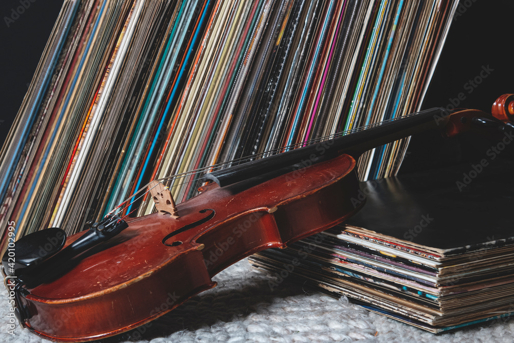 a violin is leaning against a pile of vinyl records