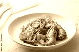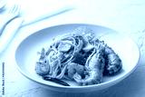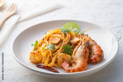 Spaghetti Tom Yum Kung,Thai style fusion food, spicy pasta with Giant freshwater prawns in tom yum sauce.