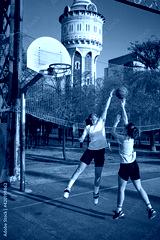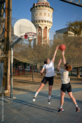 Shot interrupted for make a plug to his opponent from scoring points on a city court on a sunny morning.
