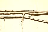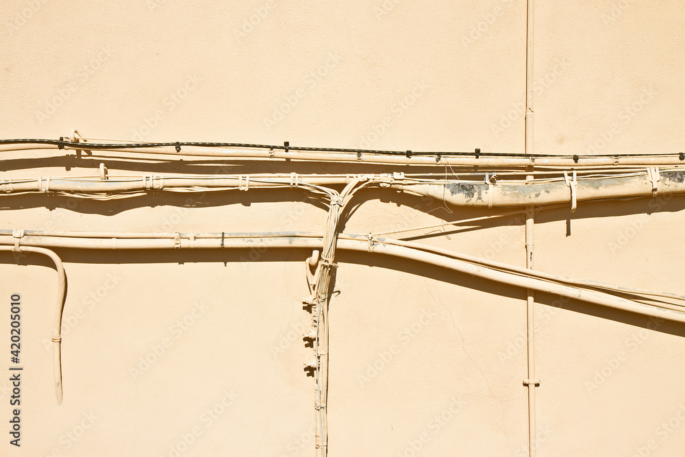 Electrical power cables and telephone cables against an old brick and plaster wall for the distribution of electricity supply