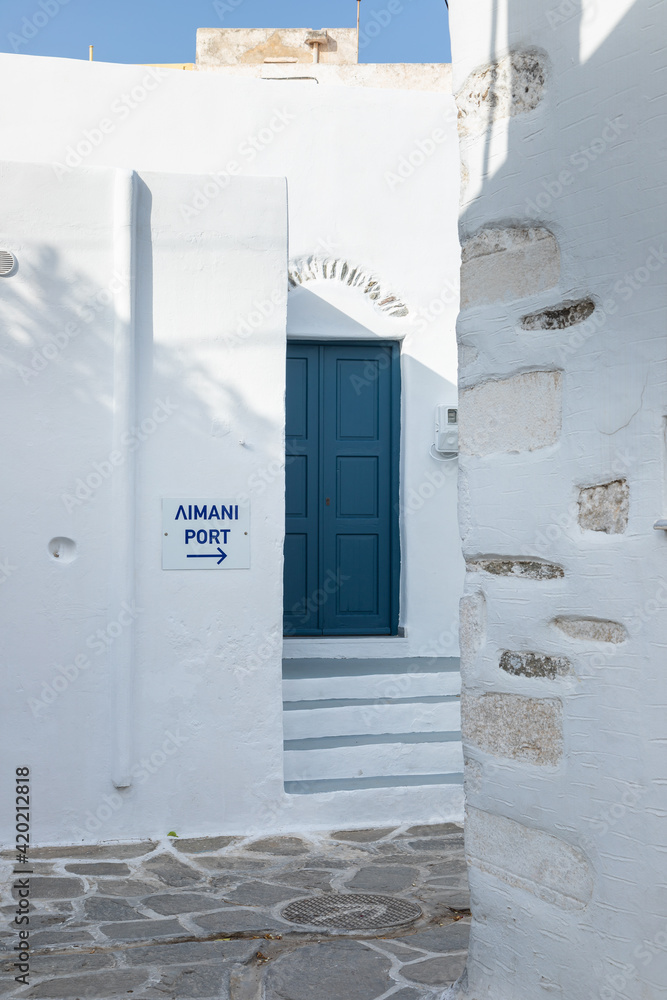 View of the white facade of building in Parikia, Paros Island, Greece.