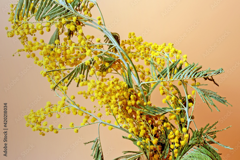 Mimosa branch close-up on a light background