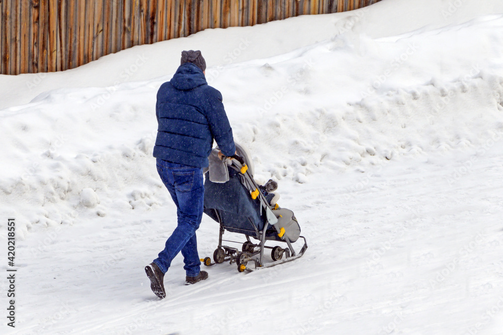 A man with a child in a stroller walks on a snow-covered sidewalk