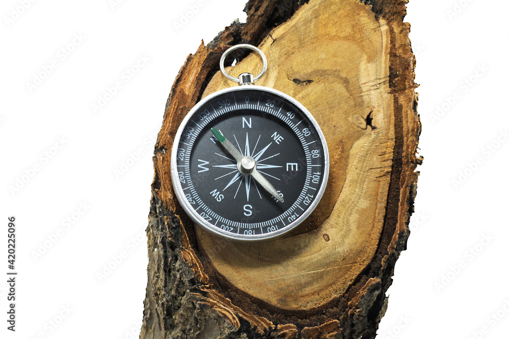 round compass on natural wooden background as symbol of tourism with compass, travel with compass and outdoor activities with compass