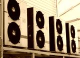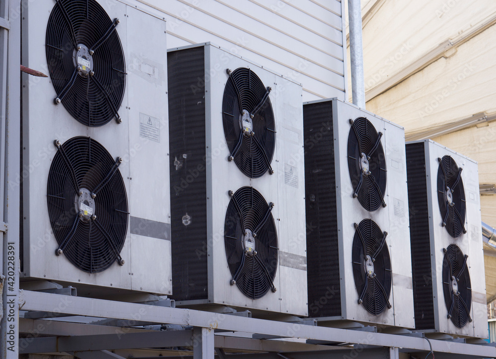 Street blocks of air conditioning systems in an industrial premises of a telecom operator. Room cooling system.