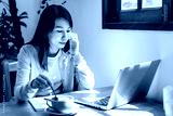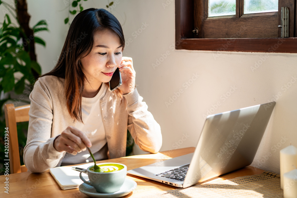 Young woman with cup of coffee using mobile phone and working on laptop at coffee shop