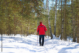 The man goes in for winter sports - nordic walking, walks with sticks through a snowy forest. Active people in nature.
