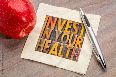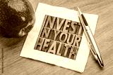 invest in your health concept - word abstract in vintage letterpress wood type on a napkin with apple, healthy lifestyle advice