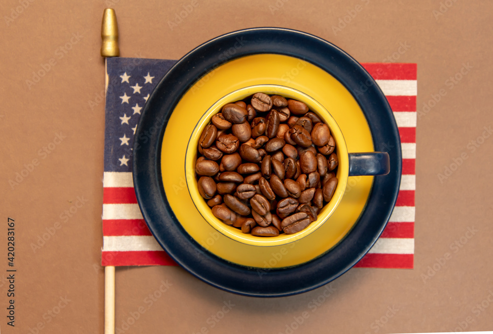 A coffee cup filled to the brim with roasted coffee beans stands on the American flag. Concept: American coffee, rich taste, export and import from America.