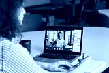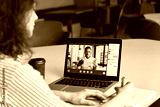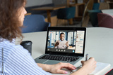 Teen girl student watching webinar, distance learning on video call with african online teacher or virtual tutor studying university seminar having online meeting on laptop screen. Over shoulder view