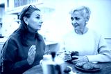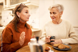 Indoor image of two stylish modern mature woman sitting at cozy cafeteria drinking hot coffee with cookies, having conversation at wooden table, talking on latest news, politics and everyday life