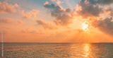 Sea ocean horizon. Skyscape with seascape. Orange and golden sunset sky, soft sand, calmness, tranquil relaxing sunlight, summer mood. Inspirational nature view, wide horizon of the sky and the sea
