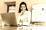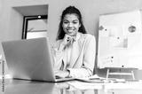 Attractive female employee is sitting at the desk, smiling and looking at the camera. Beautiful african american businesswoman using laptop, working on project or distantly studying
