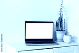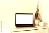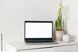Spring home office still life composition. Laptop mockup, blank computer screen. Yellow daffodils in flower pot. Cup of coffee on wooden cupboard, table. White wall background. Scandinavian interior.