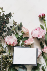 Spring, summer wedding still life scene Floral composition. Blank greeting card mockup. Pink roses, peonies flowers and eucalyptus branches isolated on white wooden background. Flat lay, top view.