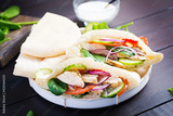 Pita stuffed with chicken, tomato, cucumber and spinach on wooden background. Middle Eastern cuisine.