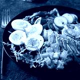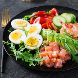Ketogenic diet breakfast. Salt salmon salad with boiled shrimps, prawns, tomatoes, cucumbers, arugula, eggs and avocado. Keto, paleo lunch.