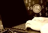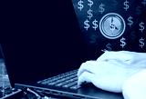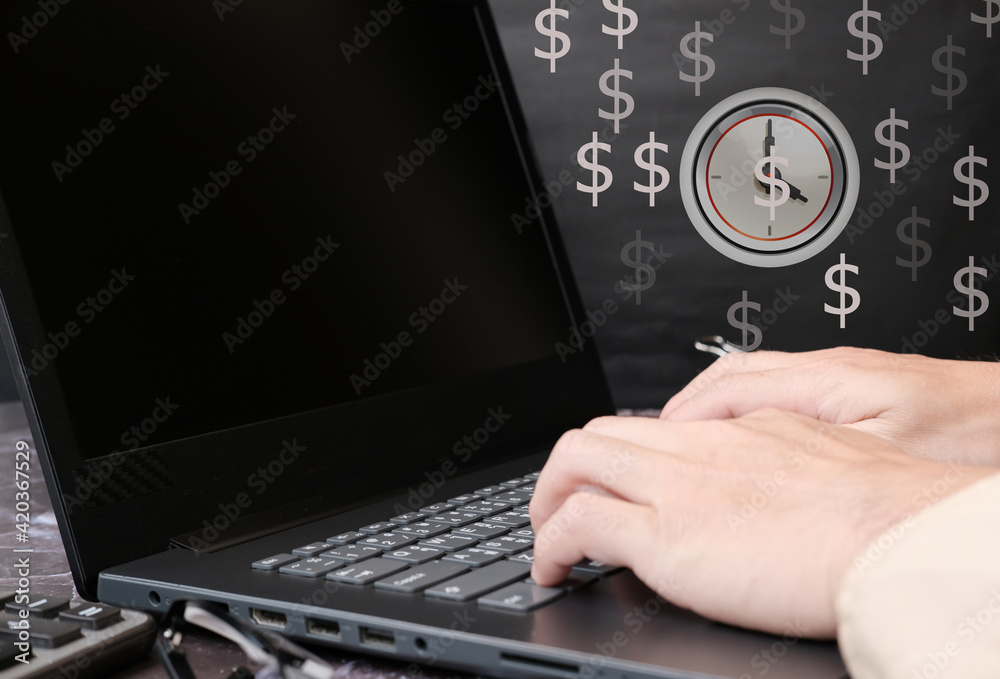 businessman hand working on laptop computer and new normal social distancing, work from home concept, marketing plan concept