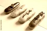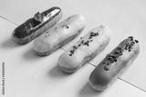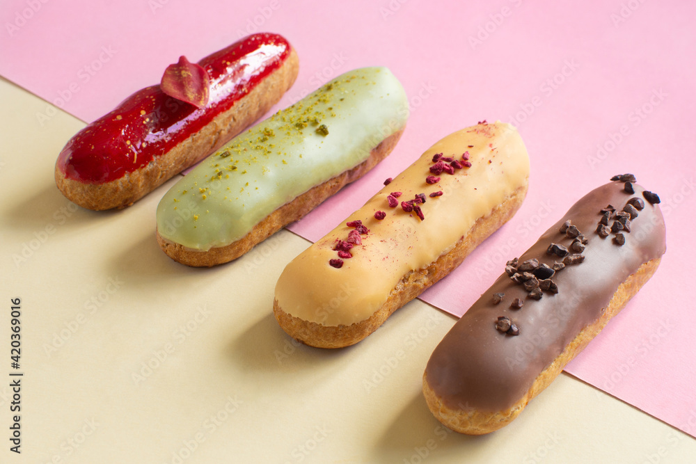 Eclairs cupcake on a minimal background. Still life hello summer mood. Concept baking, cookbook recipes, bakery banner, cafe advertisement. Vacation sales summer and holiday.