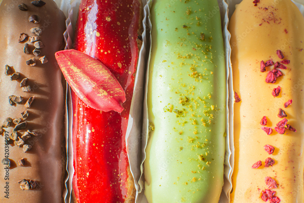 Eclairs chocolate, raspberry, pistachio and lemon close-up. Hello sweet mood. Concept baking, cookbook recipes, bakery banner, cafe advertisement. Vacation sales summer and holiday.
