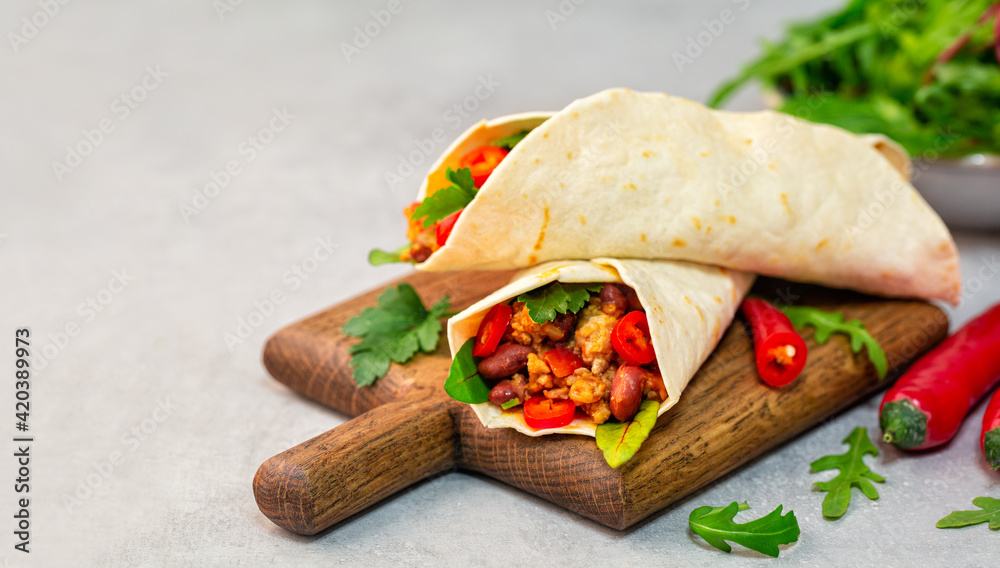 Burritos. Flour tortilla with fried ground meat, cooked beans, tomatoes, chili sauce and chili peppers. Light grey background. Copy space.