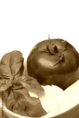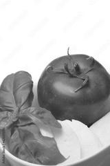 Tomato, fresh basil leaves and mozzarella.